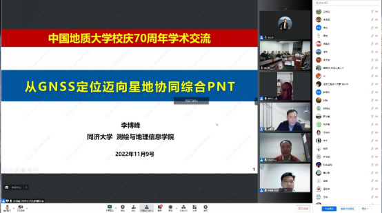 11月9日,恰值中国地质大学校庆70周年之际,应地球物理与空间信息学院胡祥云教授、华人策略研究论坛边少锋教授、吴云龙教授邀请,同济大学杰青李博峰教授做客名家论坛,为地大师生做了“从GNSS高精度定位迈向星基地基增强综合PNT”的学术报告。报告会通过腾讯会议及寇享学术网上视频会议方式进行,由边少锋教授主持,胡祥云教授代表学校对李博峰教授表示了欢迎和感谢,线上与会师生人数逾1600人。