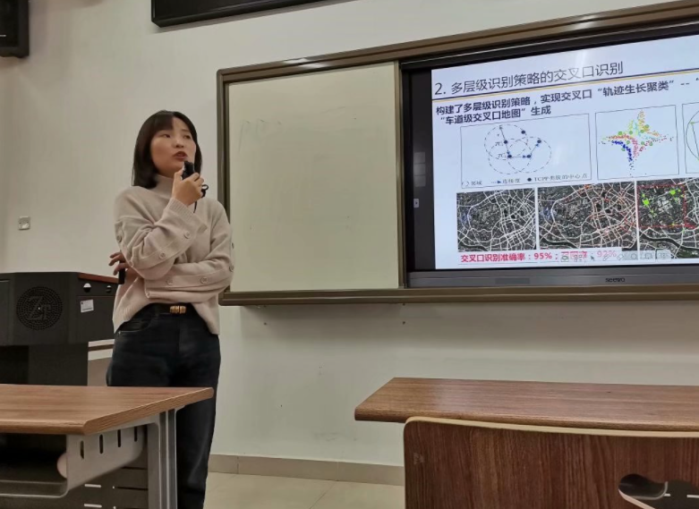 随后杨雪副教授向我们介绍了基于众源轨迹的城市道路信息感知的研究思路,首先提出了众源轨迹大数据质量分析方法,即基于运动一致性的数据清洗方法,包括运动建模、分级清洗等,目的是解决众源轨迹大数据清洗难题,接着详细介绍了多层级识别策略的交叉口识别,还提出了城市车道级道路网自动变化检测的方法。