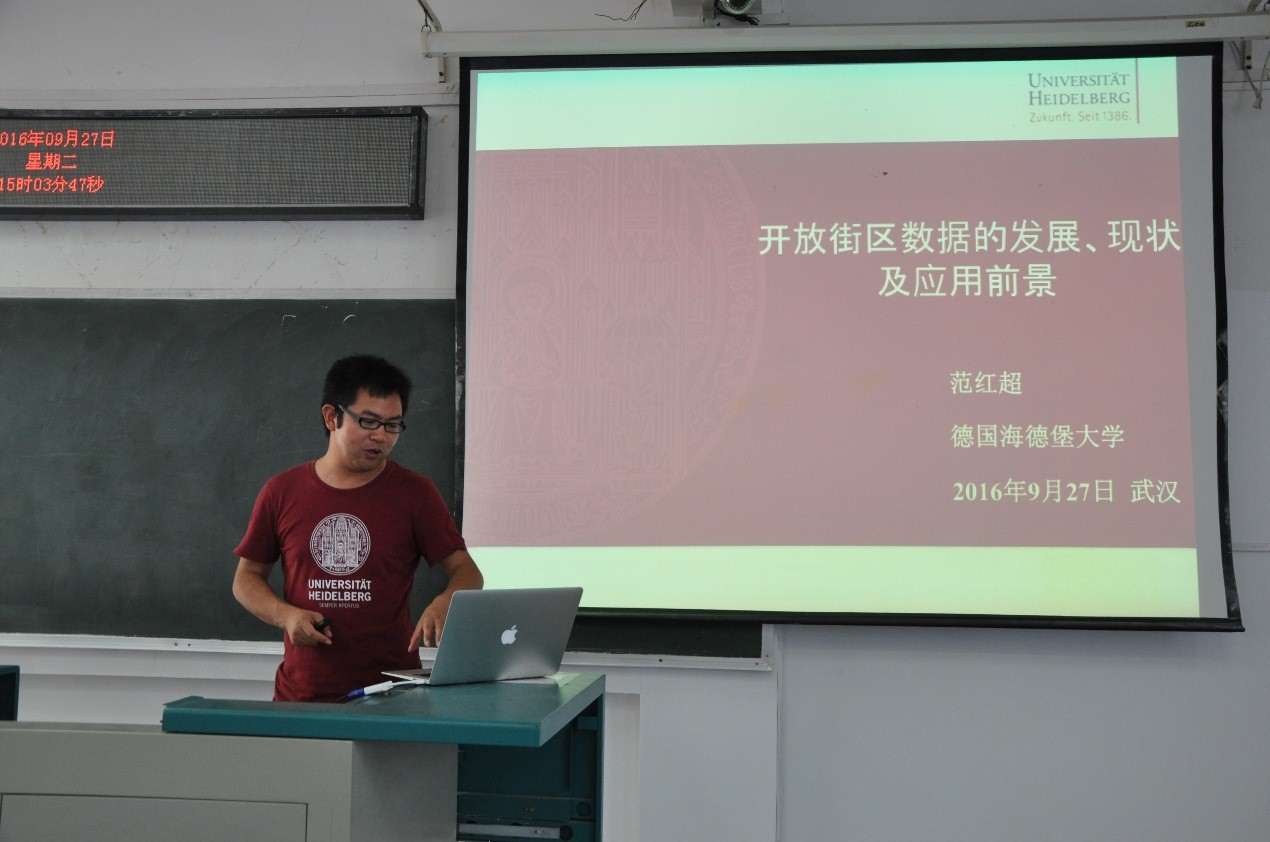 9月27日下午三点,应信息工程学院尚建嘎副教授邀请,德国海德堡大学地理信息科学研究所范红超博士在教三楼201教室为华人策略研究论坛学生做题为“开放街区数据的发展、现状及应用前景”学术报告。
