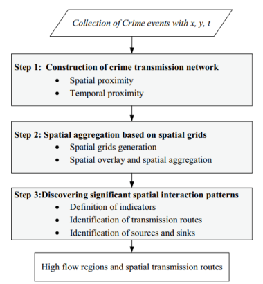 时空关联模式挖掘是时空数据挖掘的主要研究内容之一,亦是探索多类型地理事件分布格局与交互作用的有力工具。为此,本文借助时空关联模式挖掘的理论方法,引入生态学中的“源-汇”概念,尝试探索邻近重复犯罪事件的时空交互模式特征,整个方法流程如图1所示。首先,根据时空邻近域构建是犯罪事件的有向传播网络;进而,考虑到犯罪传播网络的杂乱性,基于给定大小的空间网格对犯罪网络进行空间聚合与简化;最后,定义时空关联模式度量指标,对网络中显著的热点区域与传播方向进行提取。实验结果表明,本文方法可以有效发现海量犯罪事件数据中发现空间传播规律,更好揭示犯罪事件转移特征及其空间影响因素,从而为预防犯罪和城市规划起到一定的指导作用。